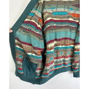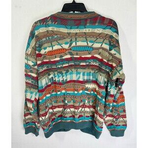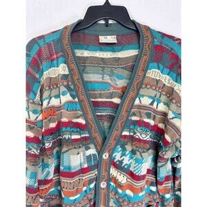 Rare Vintage 90s Coogi Australia Cardigan Button Sweater Mens XL Turquoise Multicolor Wave 3D Knit. Overall in good condition with typical vintage wear. Please note photo 13 shows wear holes on both sleeve hems. Photo 12 shows buttons that were replaced over the years and not original though similar size and coloring. Measurements in photos. Fast shipping!