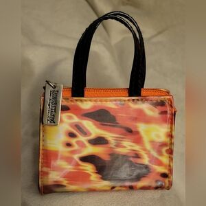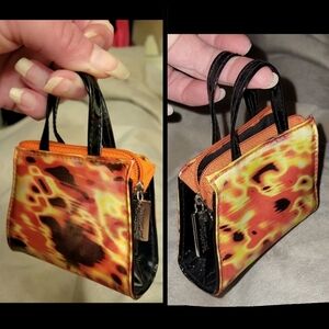 Vtg 90s Y2K Dingbatland La blk patent vinyl orange & yellow swirls holographic mini purse rare!!! when I say mini, I mean "mini"! fits in my hand & as u can see in pics my fingers hold it! it's a stash purse or for fitting a makeup compact, lipstick, id & maybe your house key for a night out on the town! (please pay attention to pics!) tilt one way & you have a whole new bag! holographic! these bags are rare & hard to find! not sure this brand is even in business anymore!