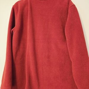 Cozy red jacket with fringe detail. Features bear embroidery and button-up front. Perfect for adding a playful touch to your outfit.