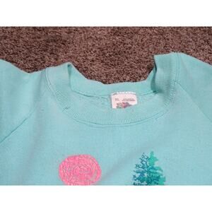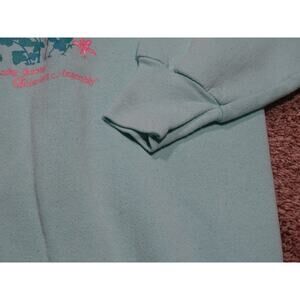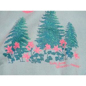 Embrace cozy, retro vibes with this authentic vintage Fruit of the Loom sweatshirt from the 1990s, proudly Made in the USA. This XL crewneck comes in a charming aqua hue, perfect for adding a pop of vintage color to your wardrobe. The front features a serene nature graphic depicting green evergreen trees and a pink sun/moon over a rolling landscape, framed by delicate pink flowers and the text Lake James Christian Assembly