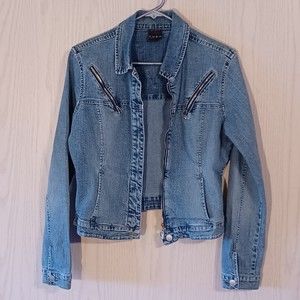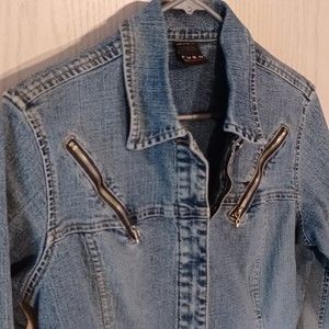 Vtg 90s FUBU The Collection Denim Jacket, Size L, Zipper closure, side vents, and pockets