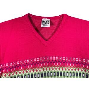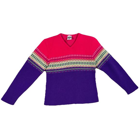 Vtg 90s Girls Ski Sweater Bright Pink Purple Green Geometric Fair Isle Size Large USA