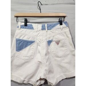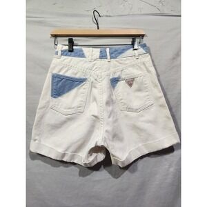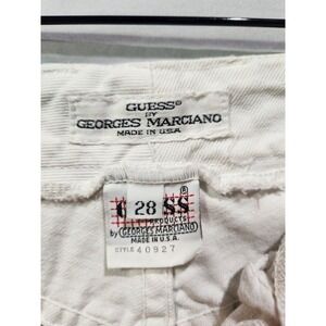 The product is a pair of vintage Guess by Georges Marciano cuffed mom shorts from the 1990s. The shorts feature a classic white color with blue accents, a regular size fit, and a waist size of 28 inches. Perfect for those looking for a retro addition to their wardrobe, these shorts offer a unique style with a touch of nostalgia from the iconic Guess brand.