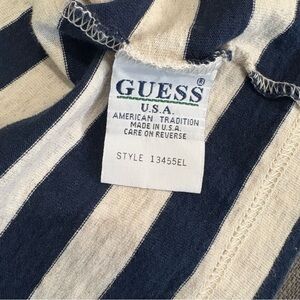 Nice vintage 90s Guess Jeans long sleeve striped shirt in 100% cotton. Made in USA. The colors are navy blue and a grayish-cream. The neckline is higher than a typical t shirt. Some stretch. Measurements approximately: