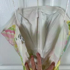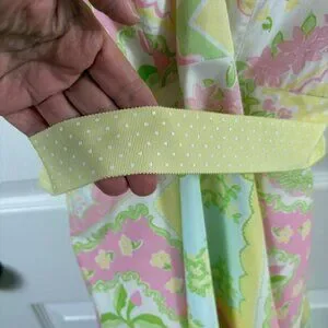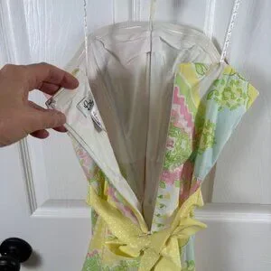 This vintage (1990s) cotton halter dress from Lilly Pulitzer showcases a beautiful patchwork floral print in a sunny palette of pink, yellow, and green. Designed with a classic fit-and-flare silhouette, it features a sweetheart neckline and a removable yellow polka dot grosgrain ribbon belt that cinches the waist. The bodice is structured with internal boning for a secure fit, while the halter straps tie at the neck for an adjustable look. Finished with a concealed back zipper and full lining, this piece captures a timeless preppy aesthetic perfect for garden parties or summer weddings.