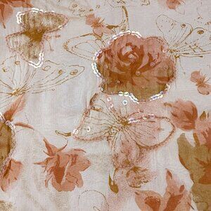 Ethereal whimsical fairy fairycore cottage cottagecore butterflies sequins Phoebe Buffay Step into the enchanted world of the 90s with this vintage Maxi dress by Victoria Holley. A blooming peach floral pattern adorns the dress, featuring a delicate butterfly and fairy theme that evokes the quaint charm of cottagecore aesthetics. Crafted from a soft blend of cotton and rayon, this dress promises comfort and a flattering drape for a regular size 14.