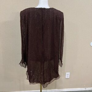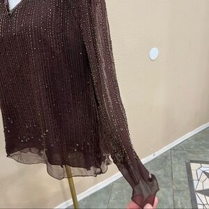 This vintage 90s Miss Morgan silk blouse in size L features intricate beaded and sequin accents, making it perfect for evening parties or formal events. The long sleeve V-neck top has a solid brown color with a pullover closure, offering a classic fit suitable for all seasons. Made from 100% silk, this blouse exudes a timeless elegance and sophistication, capturing the essence of the 90s in its style and design. Perfect for women looking to add a touch of glamour to their wardrobe.