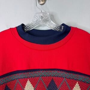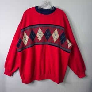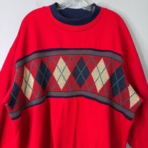 Vintage 90s Nucleus Woman Red Navy Blue Argyle Sweater Inset Sweatshirt Women's Size 2X. Red and navy blue mock layered neckline crewneck pullover sweatshirt with knit argyle (red, navy, tan and teal) insert across the chest. Relaxed drop shoulder construction.