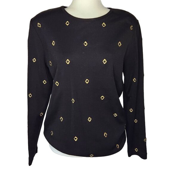 Chic vintage 1990s Outlander Collection tunic sweater in classic black with gold beaded diamond accents throughout. This longline pullover features lightly structured shoulder pads (easily removable if preferred) and a slightly relaxed silhouette for that timeless 90s minimalist-meets-glam aesthetic.