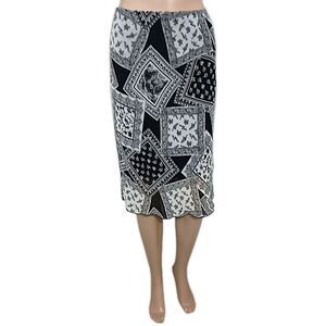 Vtg 90s Patchwork Print Midi Skirt S Lettuce Hem Sheer Overlay Bohemian Grunge. Condition is pre-owned with no rips, tears, holes or discolorations. Lettuce Hem. Sheer and lined. Elastic waist. PLEASE SEE MEASUREMENTS!! Vintage 90s sizing.