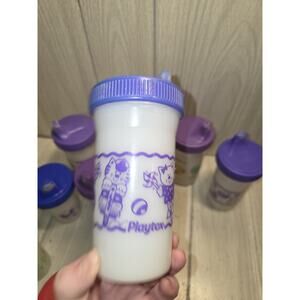 The product is a lot of 10 vintage 90s Playtex Sippy Cups with various dinosaur, fish, and chicken designs. These cups are designed for babies and feature valves to prevent spills. The multicolor cups are part of the Playtex brand and have a whimsical design that is appealing to young children. Perfect for feeding time or as a playful addition to a child's playtime.