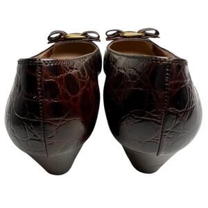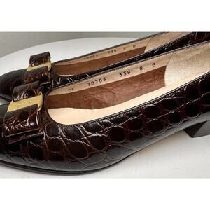 Vtg 90’s Salvatore Ferragamo Dark Brown Calf Croc Leather Gold Bow Vara Shoes Sz 8 B