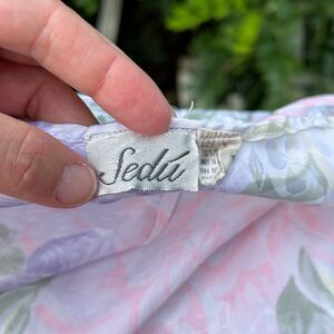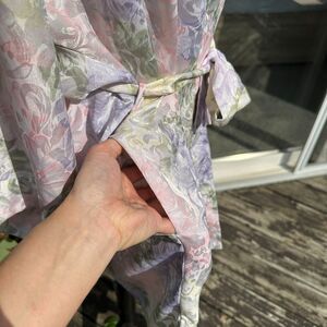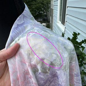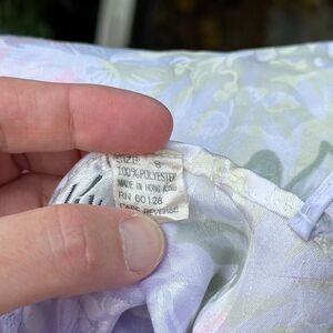 * Lightweight satin material, white base with allover pastel multicolor (purple, pink, yellow, green) floral pattern