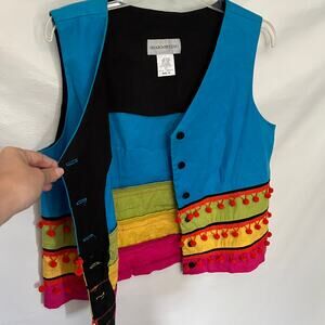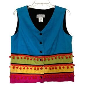 Vtg 90s Sharon Young Pom Pom Womens Vest 12 Linen Colorblock Boho Festival Artsy