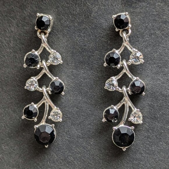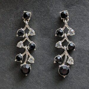 A pair of silver plated black and clear crystal dangle earrings. Vintage, from the 1990s! Stamped "97". These elegant earrings are jointed to allow for exquisite dangling, swaying movent when worn. Features clusters of alternating black and brilliant cut crystals. Earrings measure approximately 2" in length.