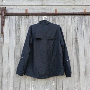 It's a full zip style of Windbreaker Jacket with reflective strips on the sleeves. It has a mesh red lining. It's in good pre-owned condition. Size Large