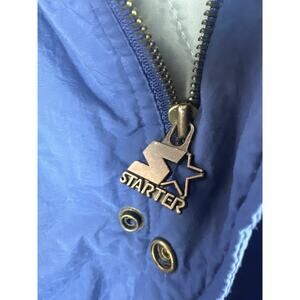Used: Flawed: There is a small cut/slit on the front button/zipper flap near the bottom hem. It appears to be a superficial slice in the outer nylon layer-not a full tear through the lining. The area remains structurally intact, the flap still functions normally, and the cut is mostly cosmetic. The PU-coated faux-suede trim on the collar and inner sleeve cuffs shows visible wear consistent with age, including areas of dirt staining and discoloration. Additionally, the nylon shell has a naturally wrinkled appearance throughout, which is typical for vintage Starter jackets of this era. These cosmetic signs of wear do not affect the structure or functionality of the coat.