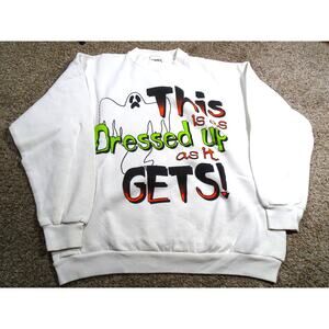 Get into the spooky spirit with this truly vintage gem! This 90s Tultex Maximum Sweats crewneck sweatshirt features a fun and relatable ghost graphic with the slogan "This is as Dressed Up as it GETS!". Perfect for those who love a subtle yet festive touch to their Halloween celebrations or simply appreciate a touch of retro charm. Made in the USA from cozy, durable fabric, this size Large piece embodies classic 90s comfort and style.