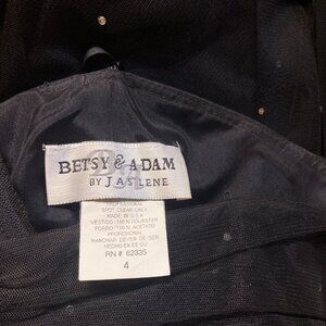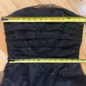 Vintage Y2K formal cocktail dress in classic retro 50s "cupcake" pinup style. Boned strapless bodice, fluffy underskirt with many layers, midi tea / swing length. Black tulle with sparkly rhinestones over a black underlayer. Designer: Betsy & Adam. Sz 4, should be a bit flexible bc of strapless bust -- waist measurement is the one to go by. EUC, no flaws, light wear. Bought new & worn once by original owner around 2006.