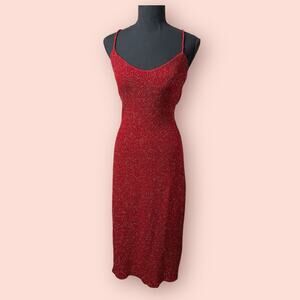 Vtg 90s Y2K Formal Dress Small Red Sparkly Midi Whimsigoth Low Open Back Bodycon