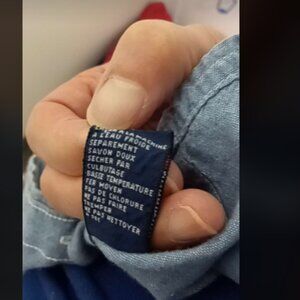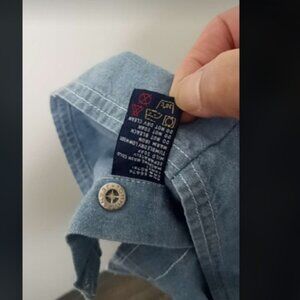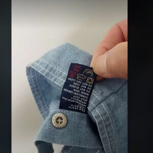 in excellent vintage condition. circa 90s to 2000s. chambray button down sleeveless shirt. color is the same palette as the logo, which is also embroidered on the front of the shirt. size 14.