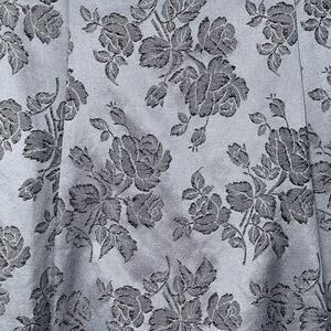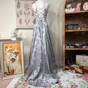 Silver metallic floral, lace up back, slight train/longer length in the back, zip back, tulle lined