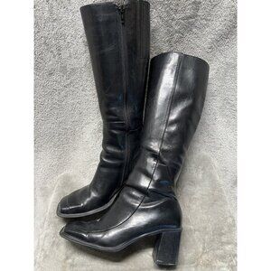 Vtg 90s Y2k Women’s 6 Black Leather knee high chunky square toe high heel boots
