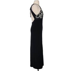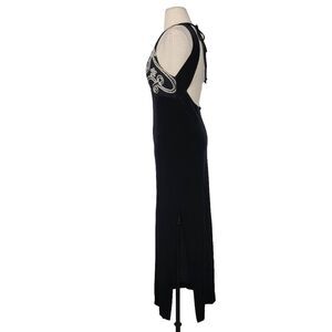 Stunning Vintage 90s Zum Zum by Niki Livas Black Velvet Maxi Dress, silver floral piping beaded Halter Neckline, ties on back of neck, large Open Keyhole Back, side zip, side slit on left leg, Polyester Spandex, union made in USA.