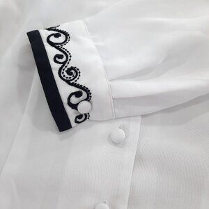 Vintage 1990s era crisp white long sleeve shirt with black swirl embroidery around the collar and cuffs.
