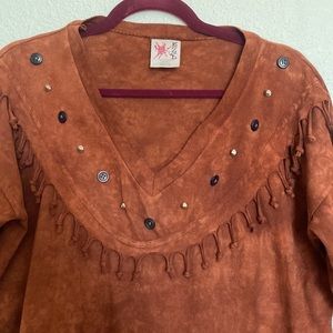 Oversized, baggy, relaxed, loose, easy fit decorative authentic nineties 90s 1990s vintage Vtg retro western Montana Yellowstone country cowgirl horse girl Wyoming Utah Arizona Santa Fe breathable Cottage core coastal, Grandma beach, holiday vacation, fringe beaded bedazzled v-neck cut leggings grunge gorpcore hippie boho bohemian avant-garde stretchy stretch comfy comfortable skinny Must-have style, classic capsule wardrobe, staple item statement piece, timeless♻️sustainable eco-natural fabric fibers Fall autumn colors tones warm neutral