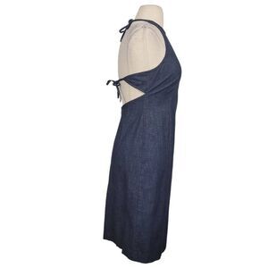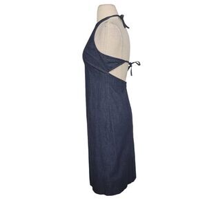 Vintage 90s Ann Taylor Stretch Denim Halter Dress, open back with tie at neck and mid back, bak zip closure, knee to Midi length, cotton Spandex blend, made in Hong Kong.