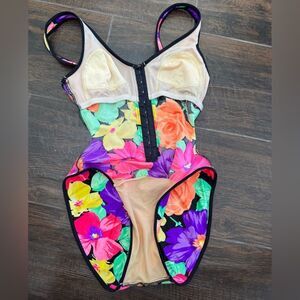 Vtg 90s LaBlanca floral 1 pc high leg deep plunge back/front hook n eye closure