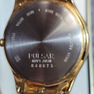 Vtg 90's Pulsar Watch Men Stainless Steel Gold Stretch WR Day Date Black Battery Quartz Excellent Condition Come With Original Box As Pictured .