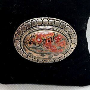 This stunning vintage combo brooch or pendant features intricate stone design in 925 sterling silver. The large oval statement piece is handmade and unique, with a colorful reddish-brown cream colored leopard jasper stone. Perfect for making a bold statement.