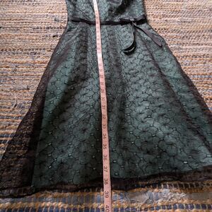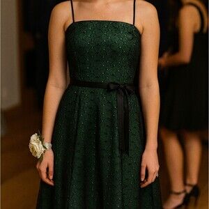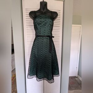 Vtg 1995 Shelli Segal Silk Emerald Green Black Spider Overlay Chiffon 2 USA Goth Wedding Spaghetti Straps Square Neck Bridesmaid Maid of Honor Satin Bow Belt Fit & Flair Knee Length Tea Length A-Line Zip Back