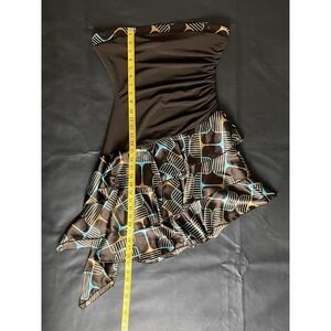 Description: Stunning and unique Vintage A. Byer Asymmetrical Tiered Mini Dress in a size Large, Made in U.S.A. This piece perfectly captures the Y2K and late 90s aesthetic. The dress features a solid brown, ruched bodice, contrasting beautifully with the voluminous, tiered skirt. The skirt boasts a bold, abstract/geometric print in shades of brown, teal-blue, and gold/tan. The asymmetrical/sharkbite hemline and tiered ruffles give it great movement and a distinct party-ready look. Made from a comfortable blend of Polyester and Spandex. A perfect statement piece for a night out, cocktail party, or themed event!
