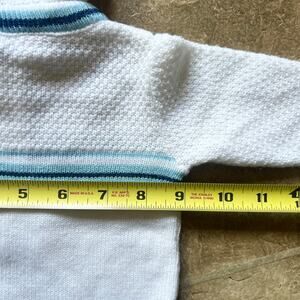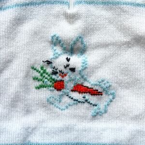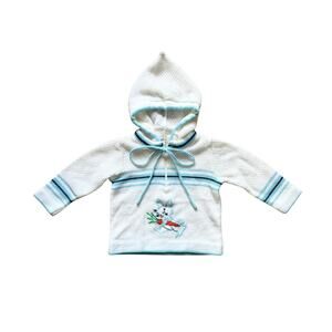 Vintage A Little Angel Baby Toddler Knit Sweater Size 6-9 Months White Blue Rabbit Print 1/4 Zip Hooded Cottagecore Dainty Winter Cozy Animals