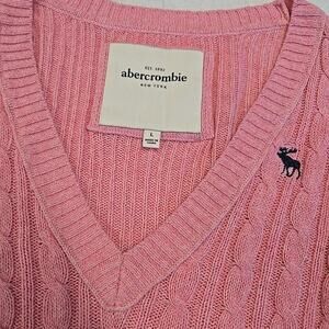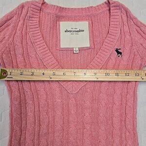 This vintage Abercrombie & Fitch Y2K cable-knit rabbit hair sweater in size L is a preppy and stylish addition to any wardrobe. The pink V-neck sweater features a slim fit with long sleeves and is made of a blend of viscose, cotton, angora, and acrylic. Hand wash only to preserve its quality. The sweater is accented with embroidered moose logo, perfect for those who love the Y2K, academia, and preppy themes.