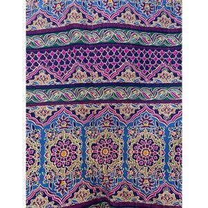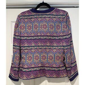 Beautiful 100% purple silk jacket from Safe Silk by Adrianna Papell featuring an intricate geometric floral print. The jacket is lined and has both snaps and buttons to hold it closed. Whimsical, quiet luxury, romantic. In overall excellent condition with a small stain on the front of the jacket - see photo.