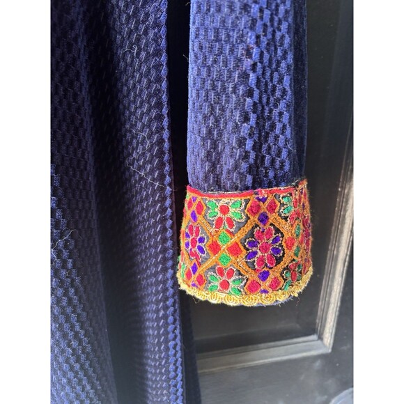Beautiful BoHo house dress I believe its from Afghanistan, its not super old, but it is beautifully made from textured velour and a very intricate embroidery piece. I think it looks handmade. There are no manufacturer labels. Some vintage wear as shown in the photos at the cuff and it looks like somebody took it in ever so slightly in the back which can easily be removed (see photos). See photos for complete details and dimensions.