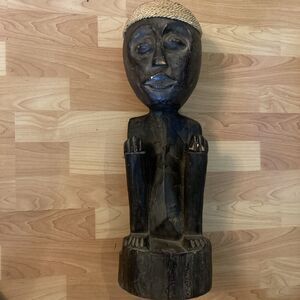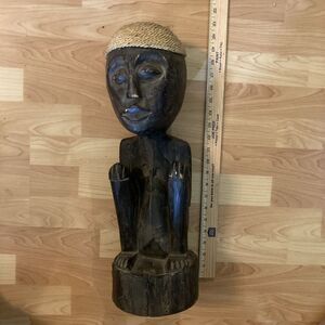 Vtg African Tribal Wood Hand Carved Primitive Statue Seated Figure Rope Hat