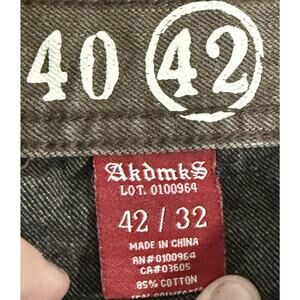 The product is a pair of vintage Akademiks men's jeans in a brown color, with a baggy straight style and Y2K embroidered accents. The size is 42x32 inches, making them a regular fit with a 42-inch waist and 32-inch inseam. Made from denim fabric, these jeans are perfect for those who appreciate hip-hop fashion from the early 2000s. The brand's unique style and embroidered details add a touch of retro flair to any outfit.