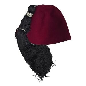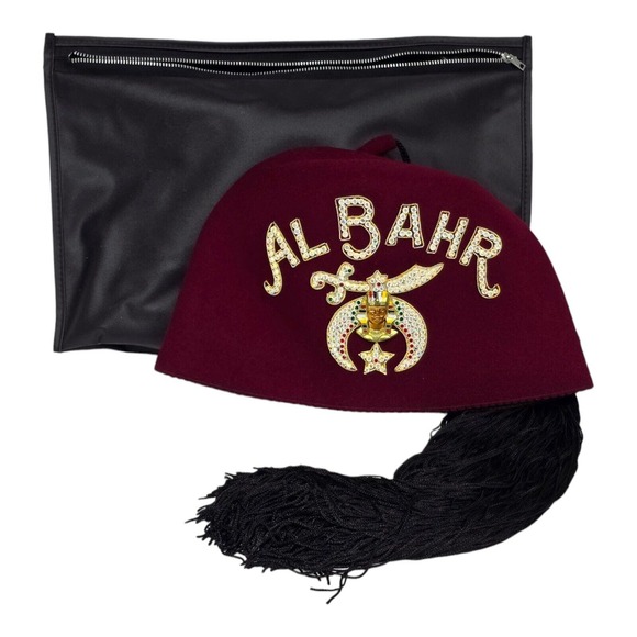 Step into a world of tradition and ceremony with this exquisite Vintage Masonic Al Bahr Shriners Fez Hat. This authentic fez, sized 7 3/8, is adorned with jewels, showcasing intricate craftsmanship and attention to detail. Perfect for collectors of Masonic memorabilia or anyone interested in fraternal organizations. The hat comes with a practical zippered bag for protection and easy storage, maintaining its pristine condition. Its rich color and decorative embellishments make it a standout piece, ideal for display or special occasions. Own a piece of Masonic history with this beautifully preserved Shriner’s fez