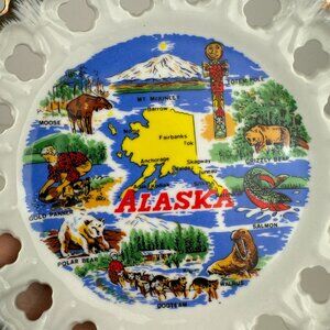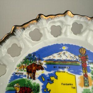 Vtg Alaska USA Souvenir Decorative Plate Dish Gold Accent Imagery Wildlife 7inch