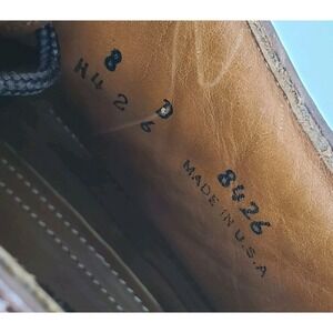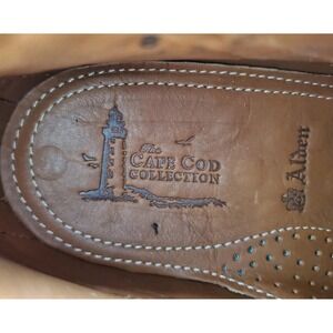 The product is a pair of vintage Alden Cape Cod Chukka boots in brown with a classic almond toe shape and lace-up closure. Handmade in the USA these boots feature a durable leather outsole and comfortable leather lining, perfect for casual or business occasions. With a hipster character and a preppy theme, these ankle boots are ideal for all seasons and come in a UK shoe size 7, US shoe size 8, and EU shoe size 41.5. The Alden brand is known for quality craftsmanship, and these boots are part of the Cape Cod Collection, making them a stylish and timeless addition to any man's footwear collection.