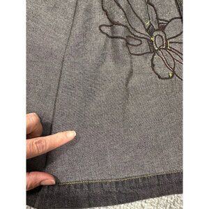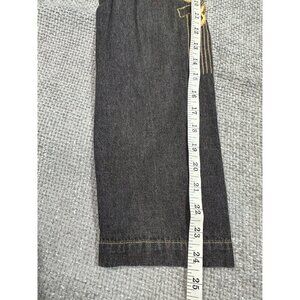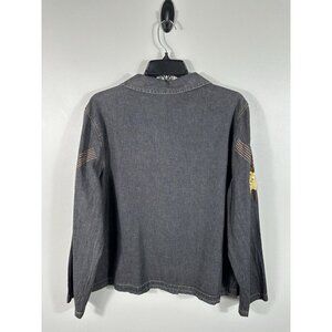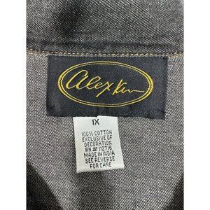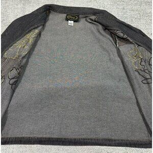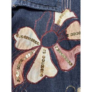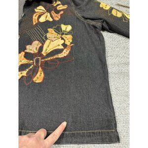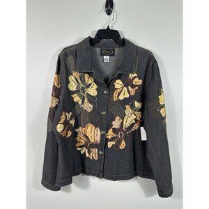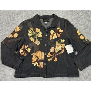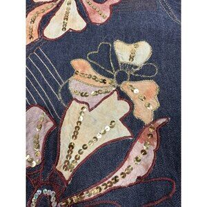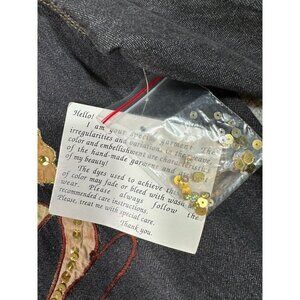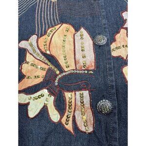 New with partial tag. Vintage Alex Kim jacket. Fabric is a lightweight denim look to it. Black/gray with brownish/orange flowers with embroidery and sequin. One arm appears a bit lighter and there appears to be a flaw in the fabric as there is a line running down one side, see pictures. Please also see pictures for measurements.