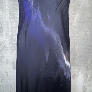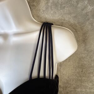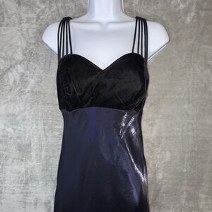 Step into a dream with this stunning vintage All That Jazz prom dress, size 7. The top features a black velvet sweetheart bodice with multiple strappy shoulders, while the bottom flows into a shimmery navy satin maxi skirt perfect for a night of elegance and nostalgia.