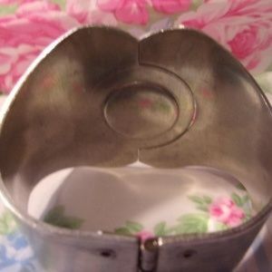 "Metal clamp style hinged bracelet, unknown maker, needs light polishing, very functional, pretty.