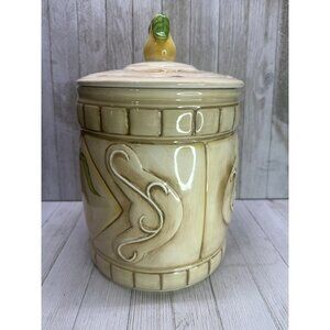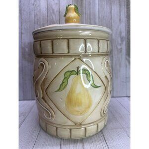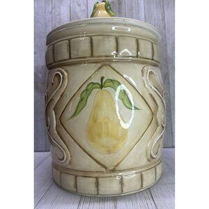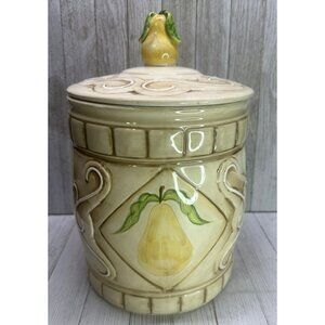 Vintage American Atelier San Marco cookie jar featuring a charming yellow pear design. Perfect for kitchen decor or storage, this 11" tall earthenware piece adds a touch of whimsy to any home.