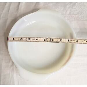 This is a vintage Anchor Hocking Fire King casserole baking dish in the Nature's Bounty pattern. It measures 9" round. This lovely dish is perfect for baking and serving your favorite meals. It is in excellent condition for its age. There are no chips or cracks. It's a wonderful addition to any kitchen or collection. Get this timeless piece today!